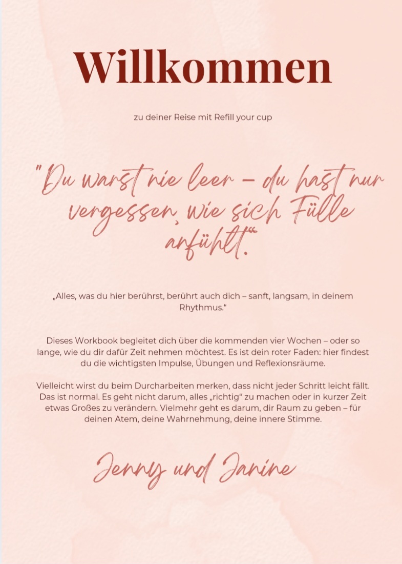 Ab dem Frühjahr 2026 wird dann der ganze "refill your cup" Workshop 1, mit oder ohne Workbook, digital erhältlich sein. Bei Interesse gerne Kontaktaufnahme