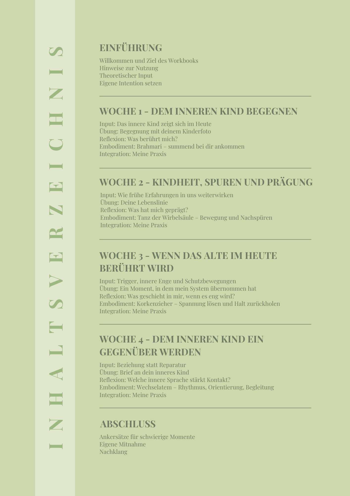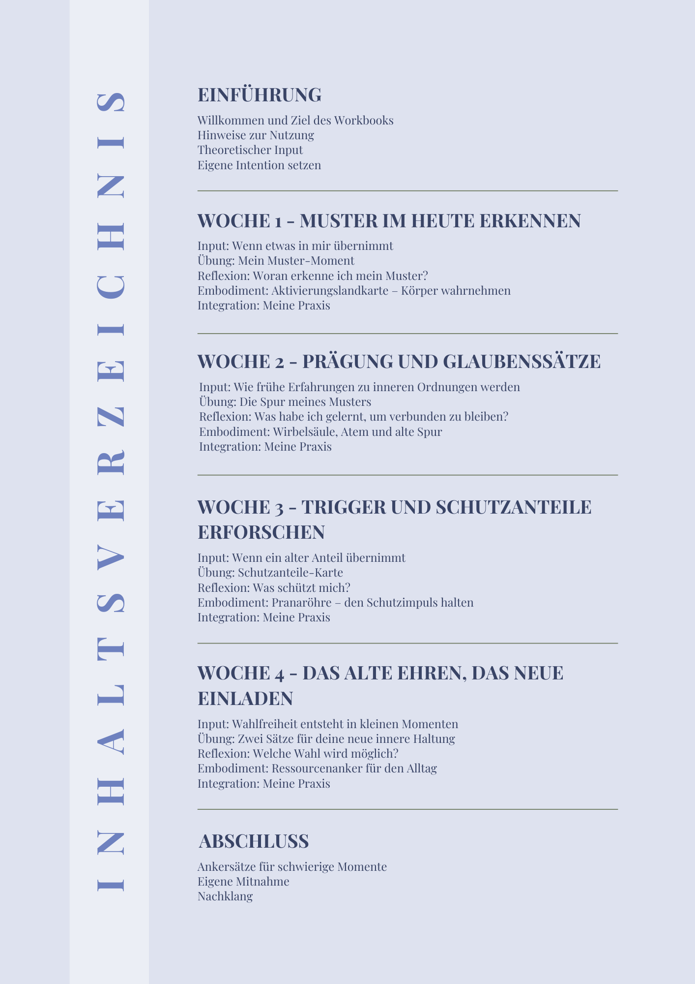 Jedes Workbook kann einzeln genutzt werden. Zusammen bilden sie eine vertiefende Reise von Regulation über frühe Prägungen und Schutzbewegungen hin zu mehr Selbstführung im Alltag.