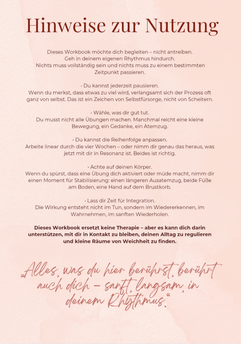 Die Inhalte dieses Workbooks – Texte, Übungen, Struktur und Gestaltung – sind urheberrechtlich geschützt und ausschließlich für die persönliche Nutzung bestimmt. Eine Weitergabe, Vervielfältigung oder Verwendung in beruflichen Kontexten (z.B. Weitergabe an Klient:innen, Teams, Kurse oder Institutionen) ist nur mit meiner ausdrücklichen schriftlichen Zustimmung erlaubt. Vielen Dank für die Wertschätzung meiner Arbeit.