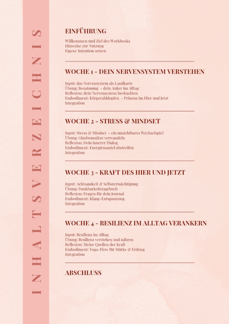Dieses Workbook führt dich über vier Wochen hinweg durch einfache, alltagsnahe Schritte der Selbstregulation. Es verbindet kurze Inputs, praktische Übungen, Reflexionsräume und Embodiment-Elemente – für mehr Erdung, Klarheit und innere Stärke.